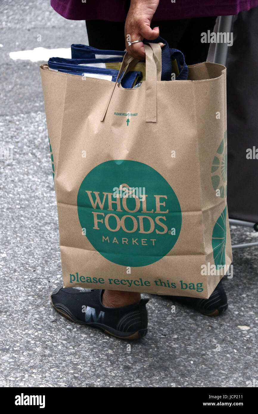 Nueva York Nueva York Estados Unidos 16 De Junio De 2017 Un Cliente Tiene Una Bolsa De Alimentos Enteros Despues De Comprar Comida Fuera Del Upper East Side 87th Street Ubicacion Whole